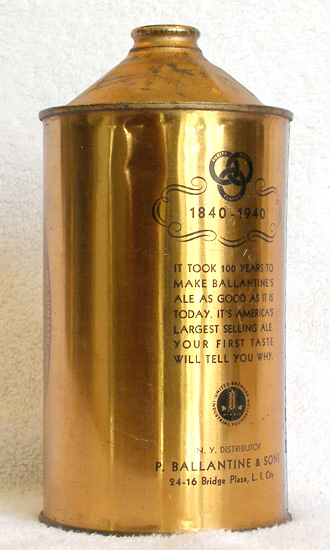 Ballantine Beer Beer Can from P. Ballantine and Son, Newark, NJ, USBC# 202-14, Grade A1+ 1840-1940. IRTP. About as nice as these come.
